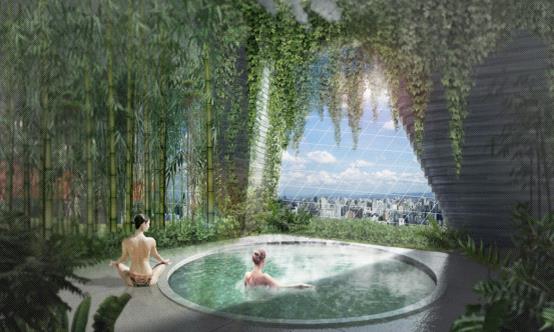 內(nèi)部構(gòu)造上,大自然的主題在架空層內(nèi)部繼續(xù)延伸,架空層中庭擺滿棕櫚樹和亞熱帶珍稀植物,樓梯和連廊通道同樣被綠植穿插覆蓋,森林餐廳、綠色農(nóng)場、露臺、咖啡館、書吧和天際泳池被包圍在粗壯的樹叢之中,很好地給城市居民創(chuàng)造了一種天空城市公園生活的范本。