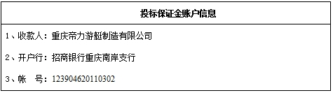 4.3、供應商報價文件資料遞交地點:重慶市南岸區(qū)廣陽鎮(zhèn)明月沱806號 , 重慶帝力游艇制造有限公司辦公樓二樓采購部。