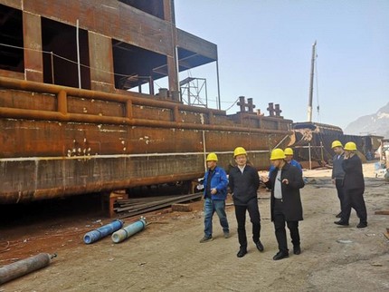 11月11日,集團公司楊勇董事長陪同彭水縣羅遠江副縣長視察彭水九黎船舶建造項目現場。該項目是集團公司旗下子公司重慶帝力游艇制造有限公司承接的彭水九黎旅游運輸服務有限公司的2艘異地船舶建造項目。游船總長44.5米,型寬10.6米,型深3.1米,吃水1.8米;躉船總長48米,型寬13.8米,型深2.8米,吃水1.8米。