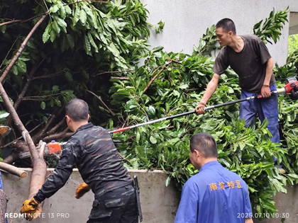 "這是和風雨'過招'的印記!"暴雨過后,搶險現場的物業人雖然滿身泥濘卻斗志昂揚。他們分工協作,有的合力拖運倒伏的粗壯樹干,有的全力清理散落的殘枝落葉,即使雙手被樹枝劃出血痕,也無人停下腳步。從最初雜亂堆積的斷枝殘葉,到逐漸恢復整潔暢通的小區道路,每一處變化都凝結著物業人的汗水與堅持。正是這份專業與擔當,守護了我們的家園,也詮釋了物業服務的價值所在。